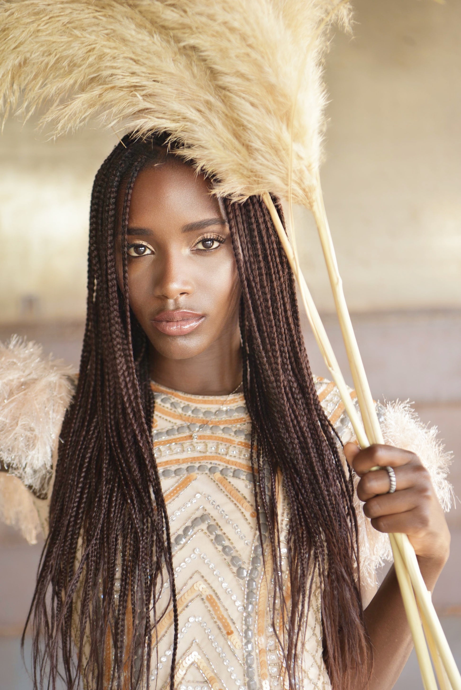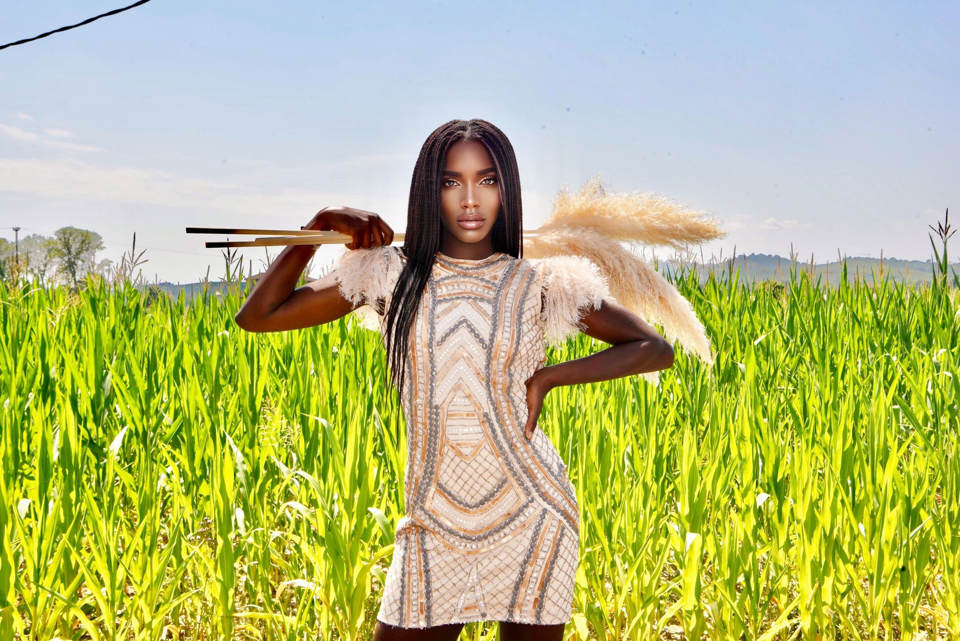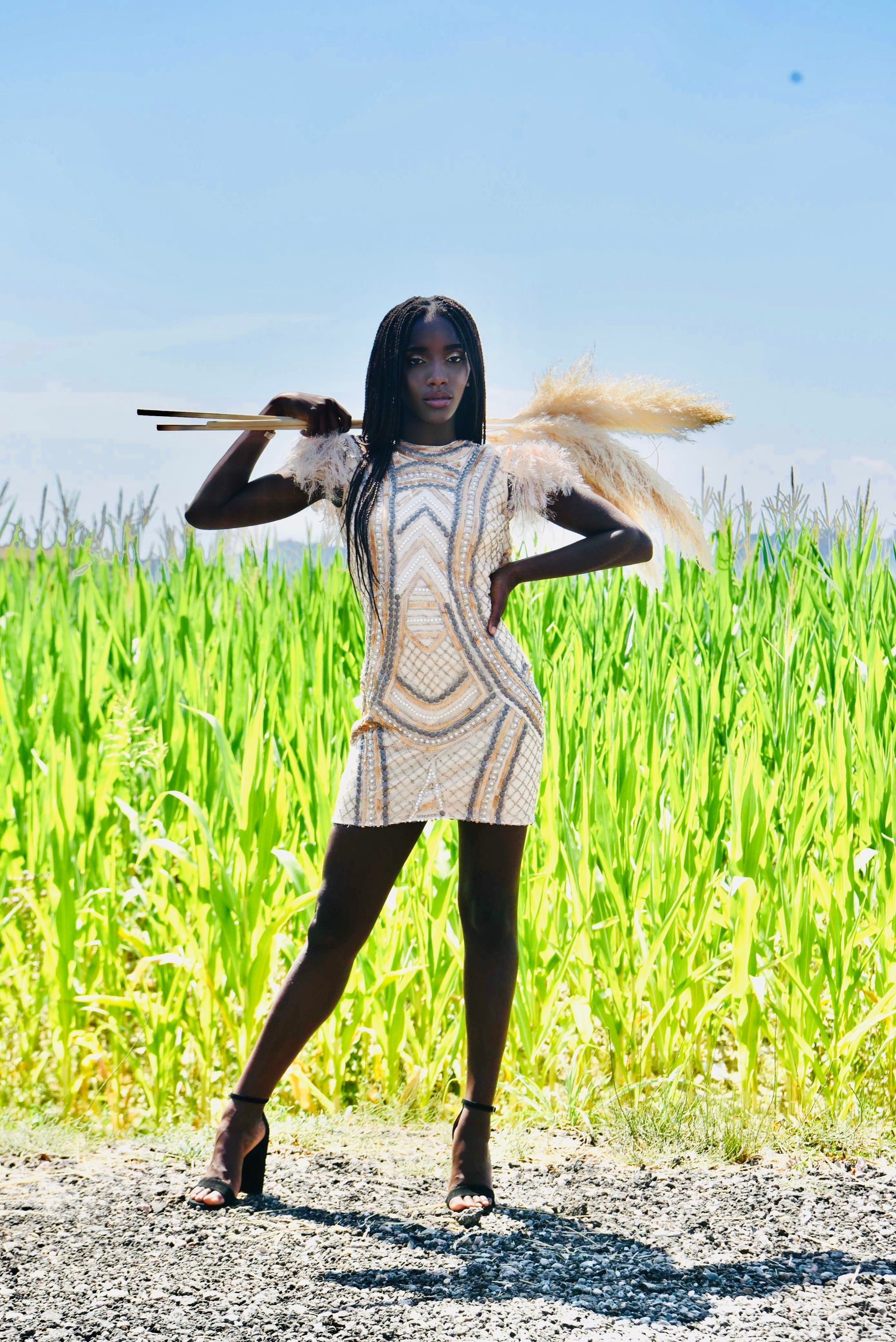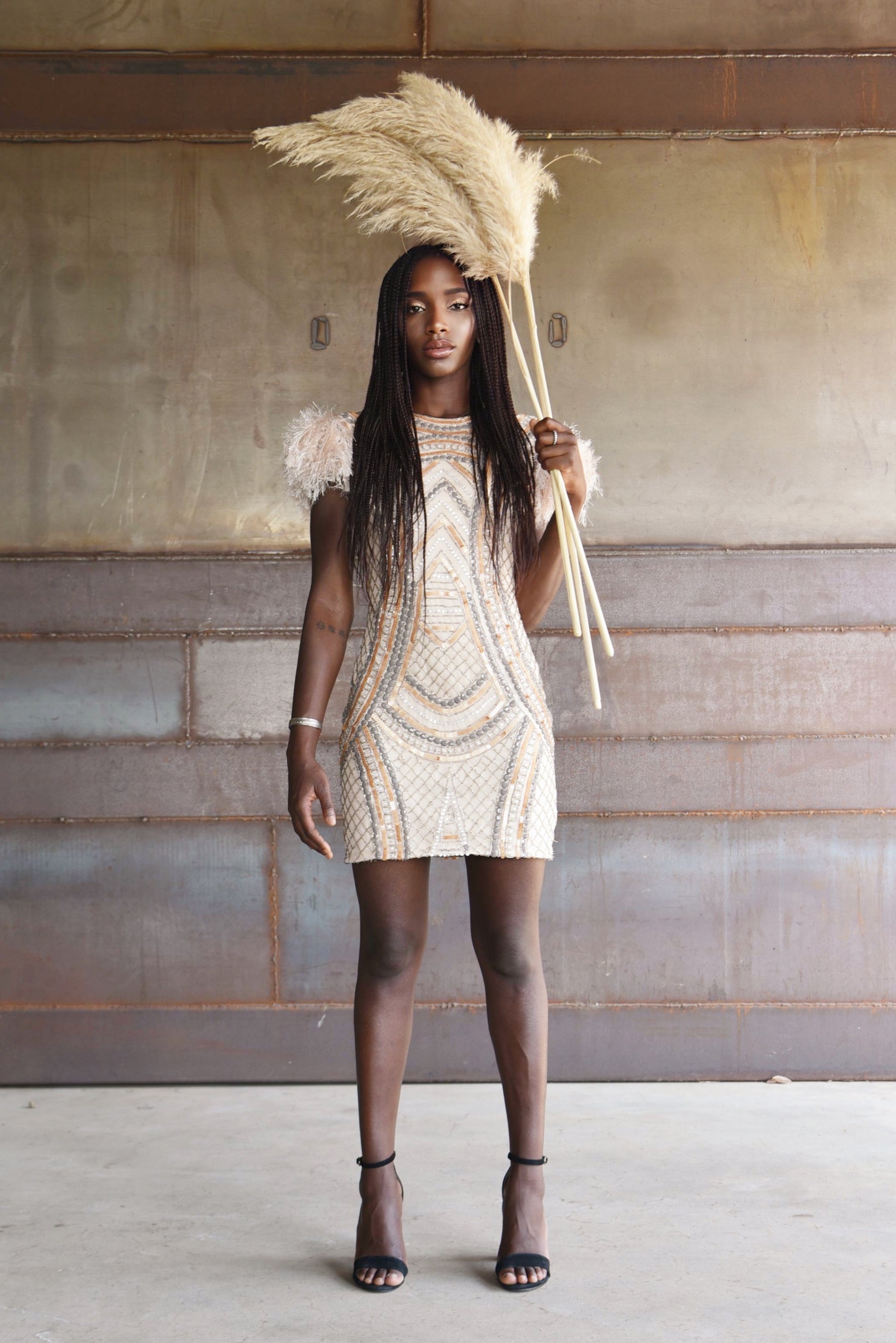This cream tulle cocktail dress, embellished with stones and sequins, combines elegance and uniqueness with shoulders decorated with fur fringe. The open back is accented with a gold chain, while the tribal motifs in sequin appliqués lend a sophisticated and modern look, ideal for those seeking a distinctive and refined look for any special event.
