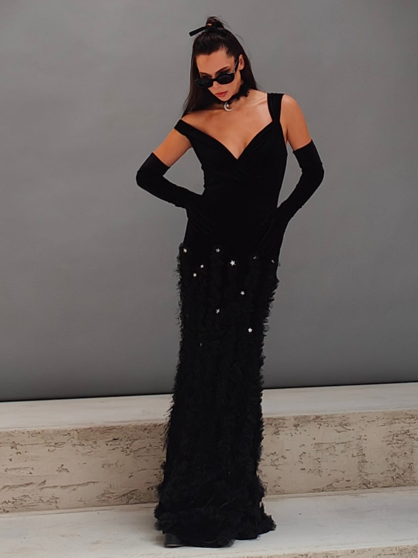 Questo abito couture in velluto nero, realizzato in Italia, combina maestria artigianale e dettagli esclusivi. Il raffinato tulle e le applicazioni di ciondoli preziosi, creati con materiali nobili e diamantati di Damasco, conferiscono un tocco di lusso unico. Il design scultoreo valorizza la silhouette con eleganza, mentre i guanti coordinati e il choker sofisticato completano l’insieme, rendendolo ideale per eventi di alta classe che richiedono stile e raffinatezza senza compromessi.