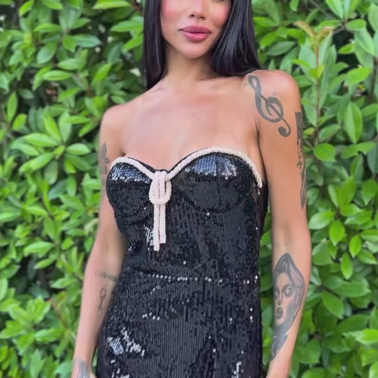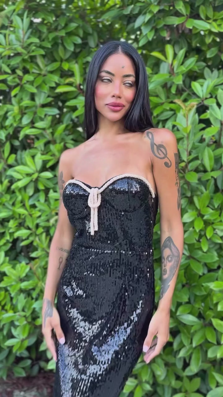 Questo abito lungo nero in paillettes, dalla linea attillata e senza spalline, valorizza la silhouette con eleganza. Il dettaglio nodo in cororoin al centro del seno aggiunge un tocco raffinato e distintivo, rendendolo perfetto per occasioni speciali dove desideri brillare con stile e sofisticatezza.