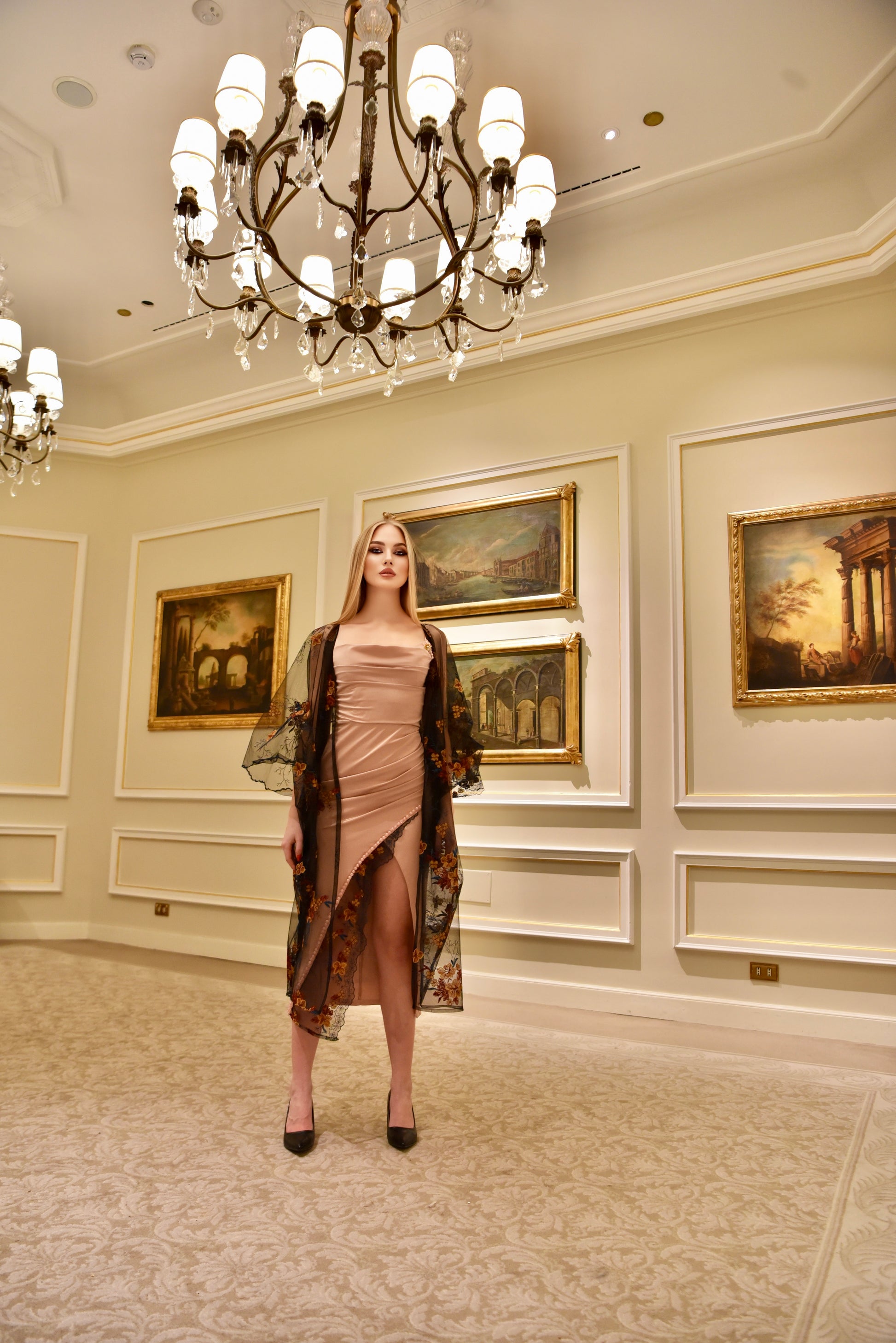 Eleganza in Contrasto: St 05 è un completo raffinato che esalta la femminilità con equilibrio tra sensualità e stile. L’abito in raso Made in Italy, dal taglio sartoriale e aderente, valorizza la silhouette con una lucentezza delicata e un tessuto fluido che segue i movimenti. Il kimono lungo in pizzo trasparente, realizzato con tessuto pregiato Made in Egitto, arricchisce l’insieme con ricami floreali nei toni caldi di ambra, bronzo e oro tenue, donando un tocco di leggerezza e raffinatezza senza tempo.