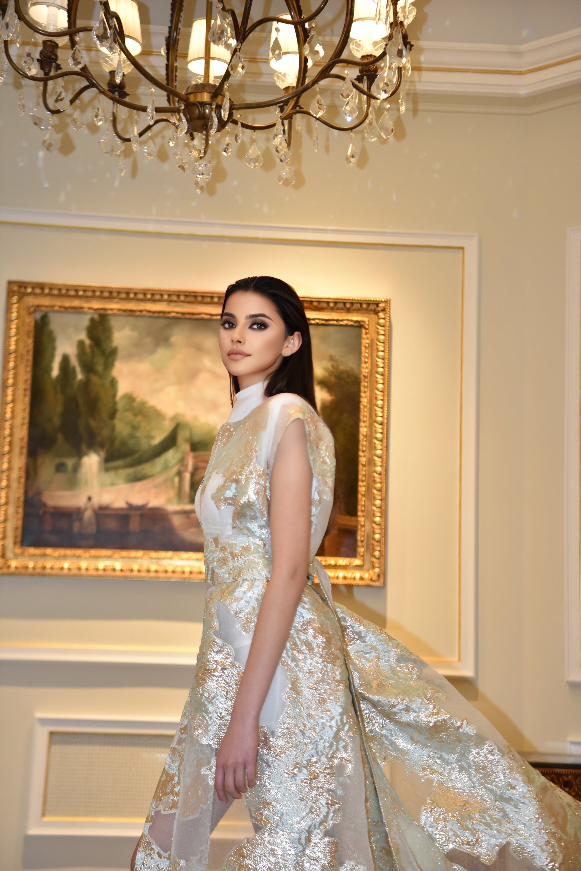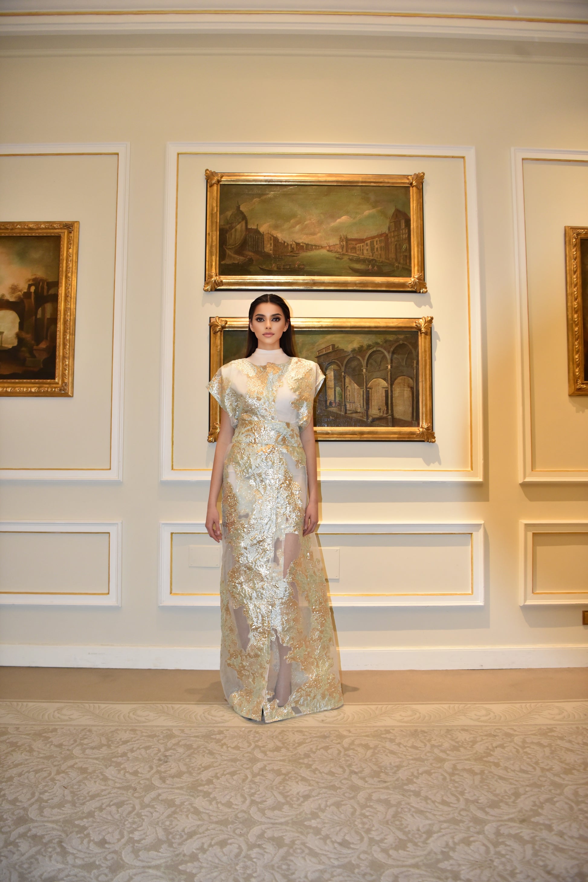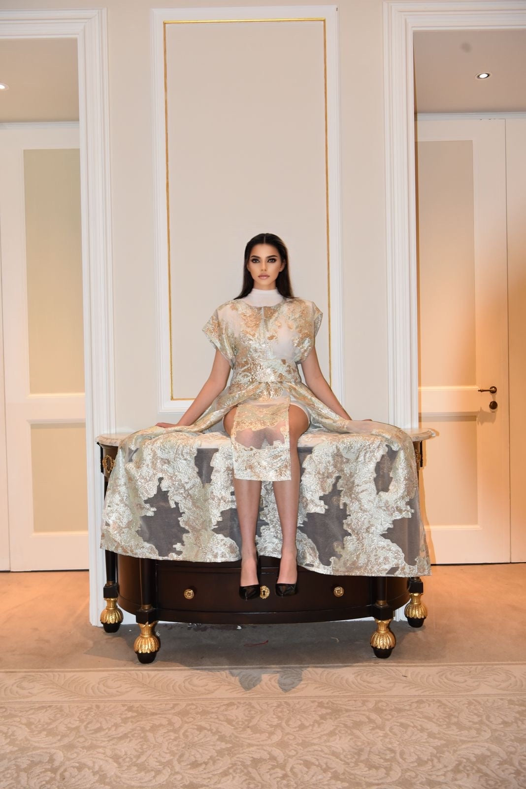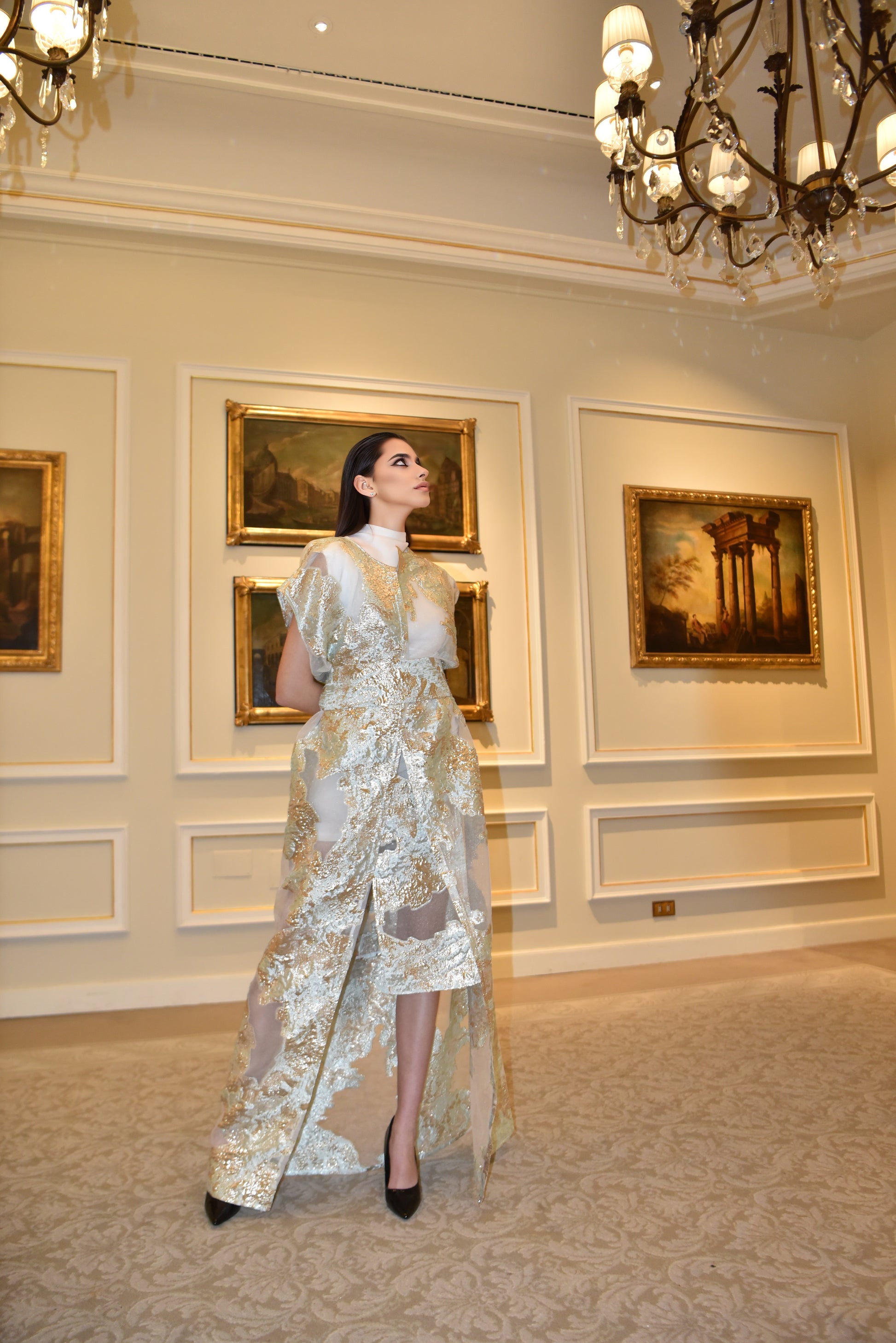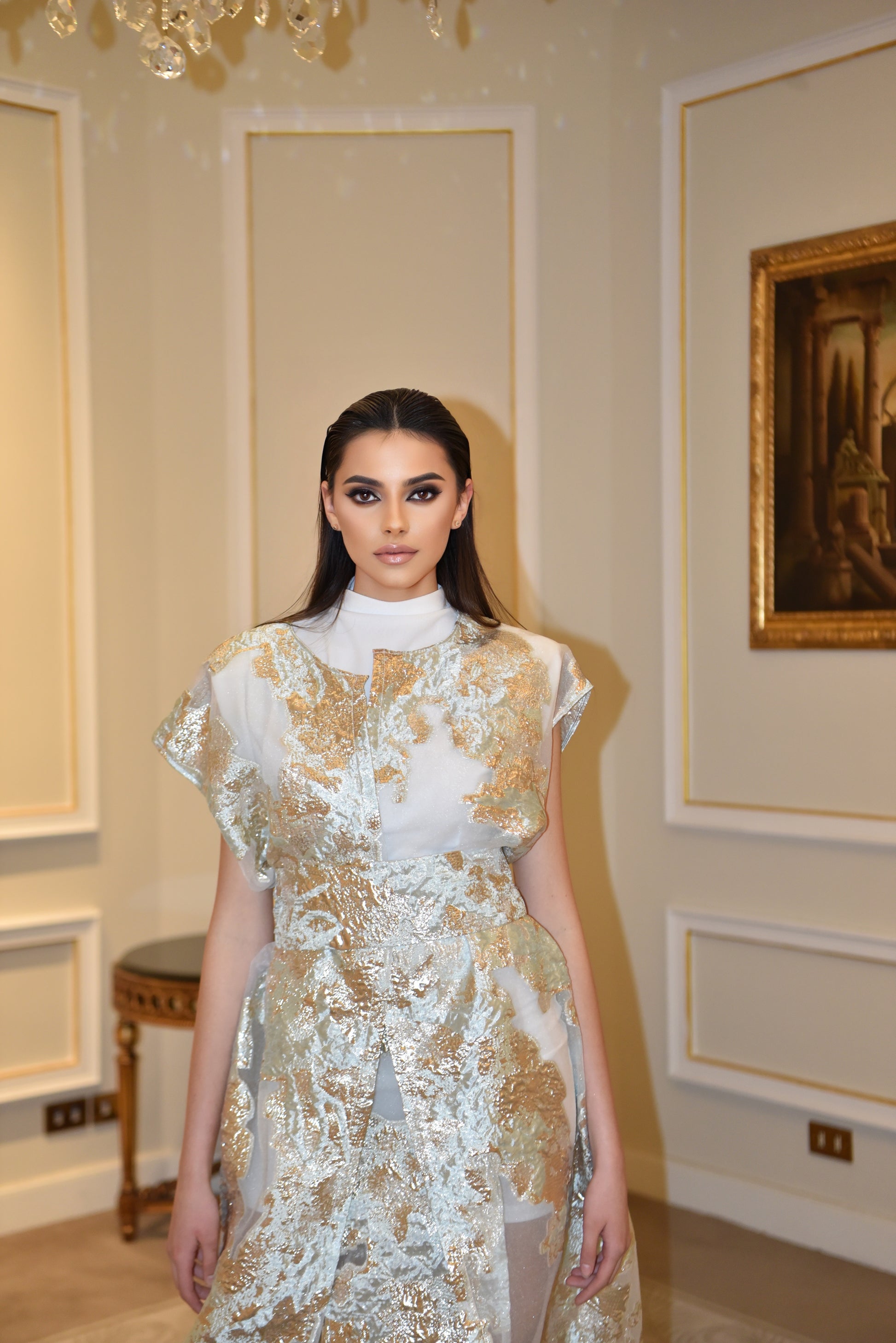 Aurora Dorata è un ensemble di raffinata eleganza, composto da un kimono lungo in tulle leggero ricamato, realizzato con una pregiata stoffa Made in Egitto, rinomata per la sua qualità superiore e leggerezza impalpabile. Il tessuto si caratterizza per dettagli dorati effetto lamé che riflettono la luce con delicatezza, conferendo al capo un fascino etereo e luminoso. La linea fluida del kimono, completata da una cintura in tessuto coordinato, valorizza la silhouette con grazia. Il mini dress bianco elasticizzato, semplice e pulito, integra inserti dello stesso tulle ricamato, creando un equilibrio sofisticato tra sensualità e stile. Perfetto per eventi esclusivi, questo ensemble racconta una storia di lusso, artigianalità e femminilità contemporanea.