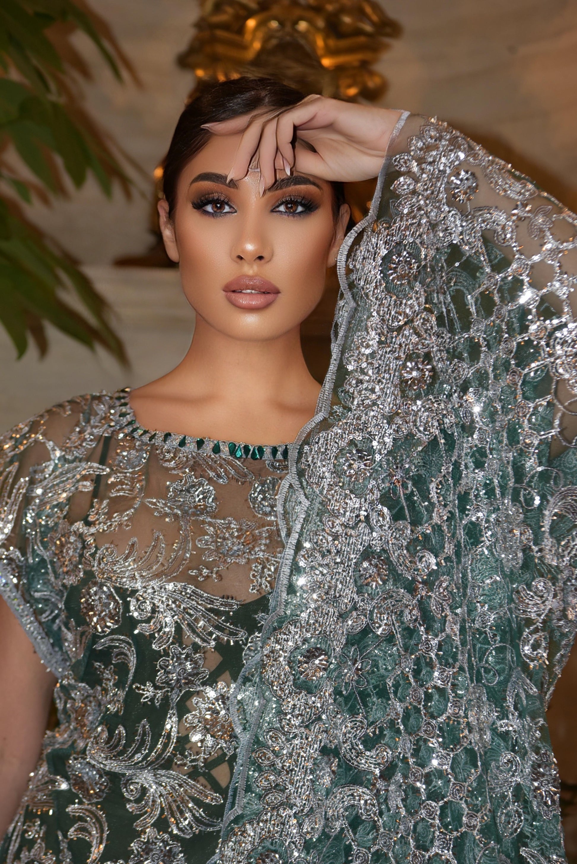 L’abito lungo “Garden Mirage” esprime un’eleganza floreale in trasparenza, fondendo romanticismo e femminilità sofisticata. Realizzato in pregiato tulle ricamato floreale Made in Egypt, avvolge la silhouette con leggerezza e raffinatezza. Il tessuto trasparente, impreziosito da ricami nei toni di verde salvia e argento perlaceo, evoca un giardino incantato al crepuscolo. I fiori tridimensionali, cuciti con cura, donano profondità e naturalezza al disegno. Il design asimmetrico con drappeggi armoniosi aggiunge dinamismo, rendendo l’abito perfetto per eventi di alta moda e occasioni esclusive.